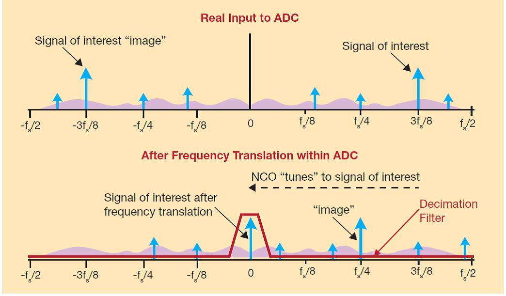DDC中的數字濾波能分擔一些工作,否則就要在前端放置嚴格的防止混疊模擬濾波器。不過,寬頻帶前端能實現多種用途,可讓DDC同時觀察多個頻帶,或者利用NCO掃描有用的頻帶以找到變化的輸入信號。