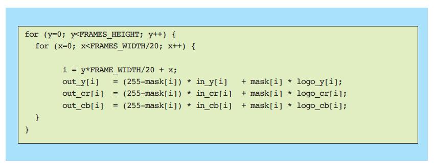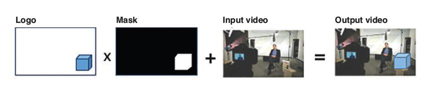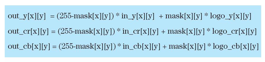 廣播企業宣傳自己視頻流最常用的方法是把企業標識用作靜止水印,因此成為我們實例設計的目標。該應用根據下列等式,以逐像素粒度插入靜止標識。