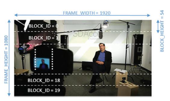 代碼內核首先修改的是在內核中定義片上存儲,以便每次存儲像素塊。片上內存用內核代碼中聲明的陣列來定義。為啟動到內存的突發事務處理,該代碼實例化memcpy命令,以將數據塊從DDR移到內核內的BRAM存儲系統中。根據片上內存資源的大小和待處理數據的量,一個視頻幀可分割成20個1920×54像素塊(如圖7所示)。