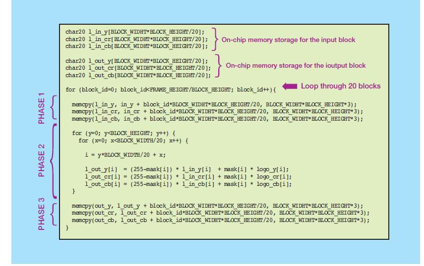 當memcry命令把數據塊放置到內核陣列中,該算法就會在數據塊上執行水印算法,然后把結果放回內核陣列。數據塊處理的結果隨后使用memcry命令傳送回DDR內存。反復執行這個操作20次,直至給定幀中所有的數據塊處理完畢。通過修改內核代碼,系統性能達到了38fps,超過了既定的30fps目標。