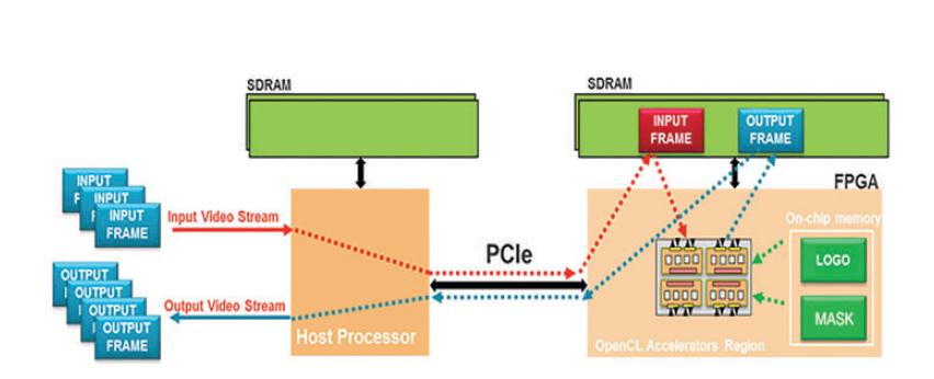 我們運行該應用的系統如圖2所示。該系統由Alpha Data ADMPCIE-7V3卡組成,該卡通過PCIe?鏈路與x86處理器通信。在該系統中,主機處理器從磁盤提取輸入視頻流,將其傳輸到設備全局內存中。設備全局內存位于FPGA卡上,可供FPGA直接訪問。除把視頻幀存放到設備全局內存中外,標識和掩膜也從主機傳輸到FPGA加速器卡上并存入片上內存中,以充分利用BRAM內存的低時延優勢。因為本應用使用的是一個靜止標識,只需在片上內存中存儲靜止圖像和布局位置數據。