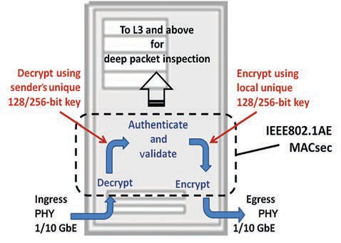 從媒體接入控制器(MAC)將以太網(wǎng)數(shù)據(jù)包提供給MACsec內(nèi)核。您可結(jié)合使用1G MACsec內(nèi)核、片上收發(fā)器和三模以太網(wǎng)MAC(TEMAC)構(gòu)建高效的小型解決方案。每個數(shù)據(jù)包都包含發(fā)起傳輸?shù)脑创a的目的地和地址。該標(biāo)準(zhǔn)保存在MACsec系統(tǒng)中,但一個重要的因素是,在多次反射傳輸中,“源碼”將是傳遞數(shù)據(jù)包的最終設(shè)備的地址。因此,與可被視為端到端方案的IPsec不同,MACsec是以逐跳方式工作的。對于每次跳躍,MACsec都要求輸入端的所有加密數(shù)據(jù)進(jìn)行解密,然后使用分配給傳輸設(shè)備的唯一密鑰再重新加密。解密的明文可在每一級提供數(shù)據(jù)包檢查功能,如圖2所示,也能供流量管理器用以管理數(shù)據(jù)流。